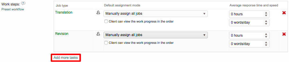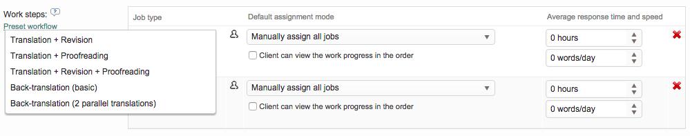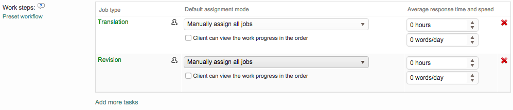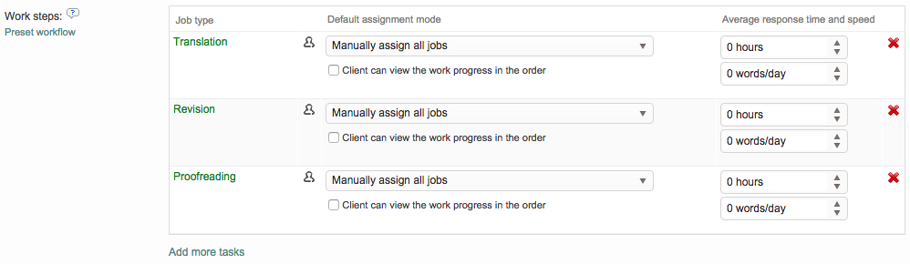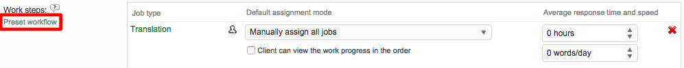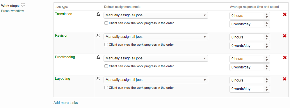 The Work Steps section determines what types of jobs will be created and assigned for the project. This includes defining the actual workflow for the project, configuring a default assignment mode, and optionally entering hours or words/per day for automatic deadline calculation.