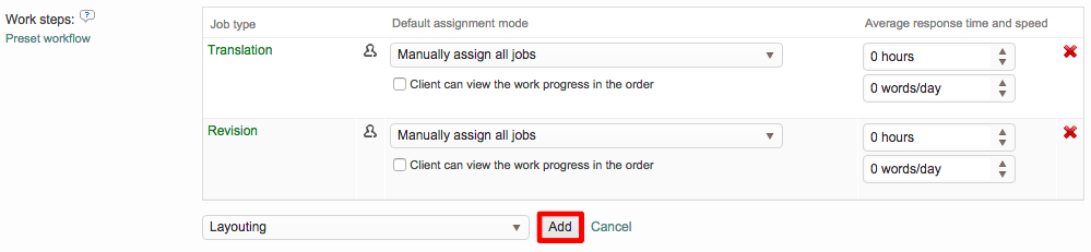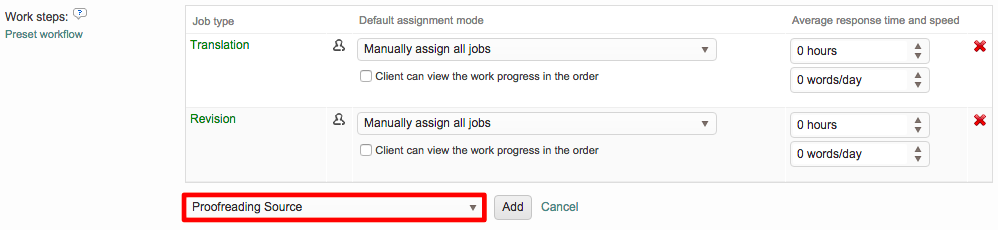 In the example below, the Translation + Revision + Proofreading preset workflow has been chosen: