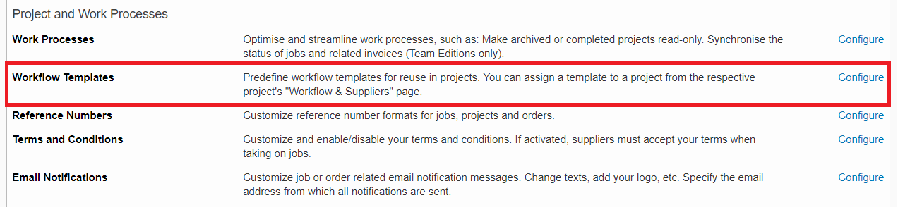 You can access these settings by going to Settings > Project and Work Processes and clicking on Configure to the right of the Workflow Templates option.